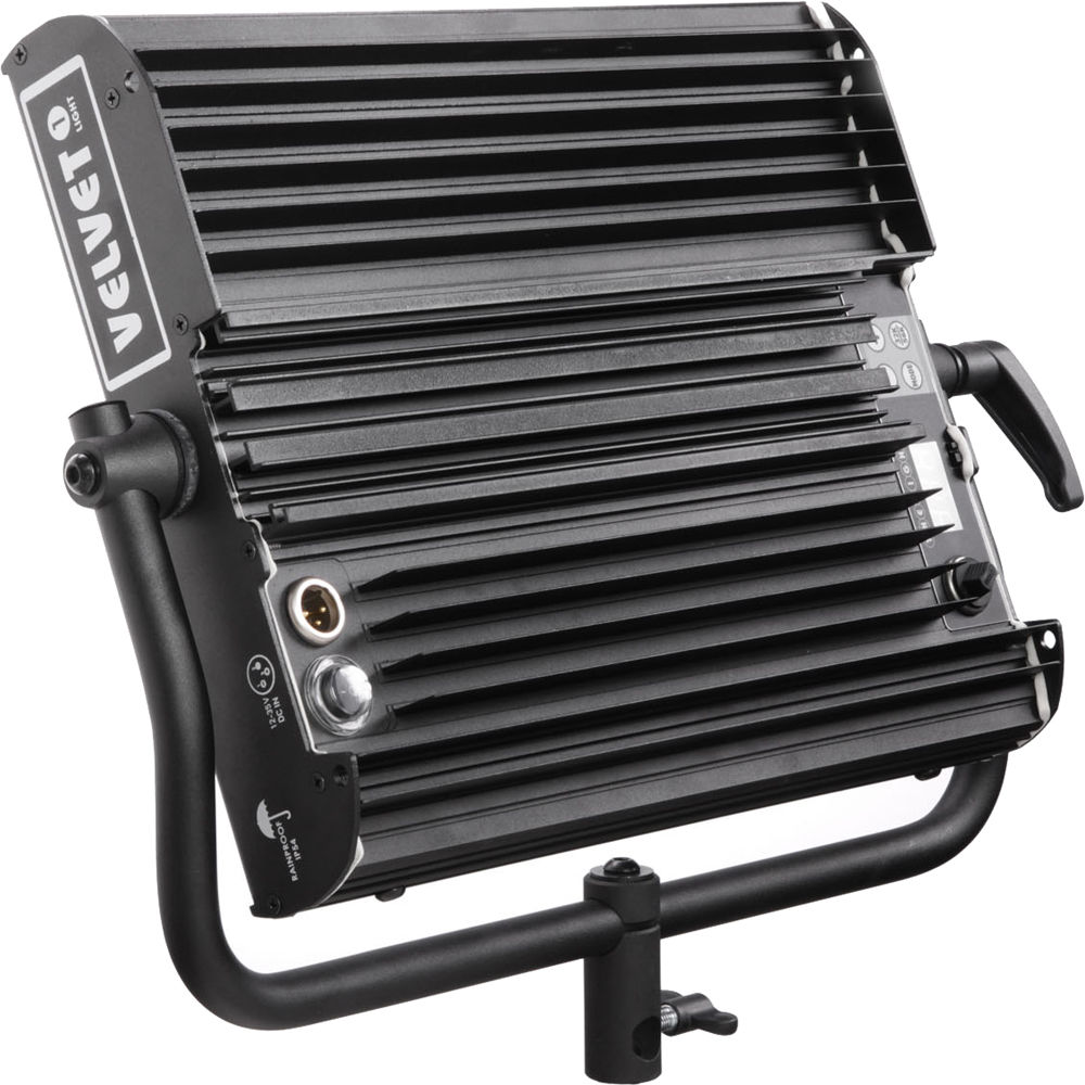 The Velvet Light 1 Rainproof LED Panel from VELVETlight is a light source with an expansive 2700 to 6500K variable color range and a high CRI/TLCI rating of 95, indicating an accurate rendering of color. Light intensity is also variable from 0-100% with flicker-free performance at over 3000 frames per second. You can make these adjustments locally on the fixture or remotely with a console via onboard DMX. The sturdy aluminum fixture has a compact form factor with an illuminated surface measuring 14.5 x 12" and has negligible generated heat, making it a wise choice for placement in tight spaces or for use close up to the talent without causing discomfort. The light's 100-degree beam angle provides ample coverage and can be tightened to 40 degrees with an optional grid to control spill light or for selective lighting. Fan-free passive cooling means that the fixture is seen but not heard, a valuable feature in sound-sensitive locations. A special feature of the Velvet Light 1 is its IP54 weatherproof rating making it ideal for shooting outdoors in rainy or inclement conditions.
